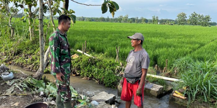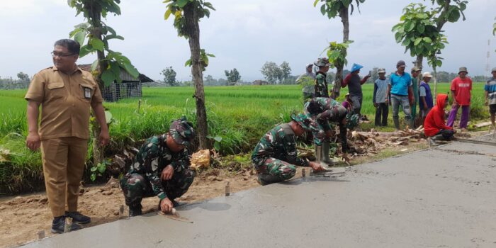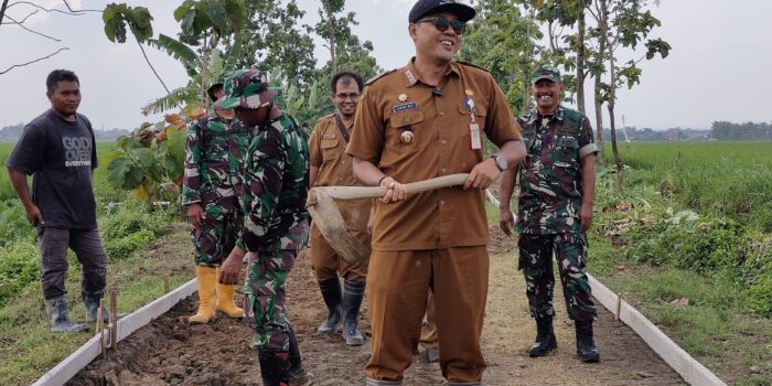 SRAGEN – Terik matahari yang menyengat tidak menyurutkan semangat anggota TNI bersama warga dalam melaksanakan kegiatan pembangunan di lokasi program TMMD Reguler