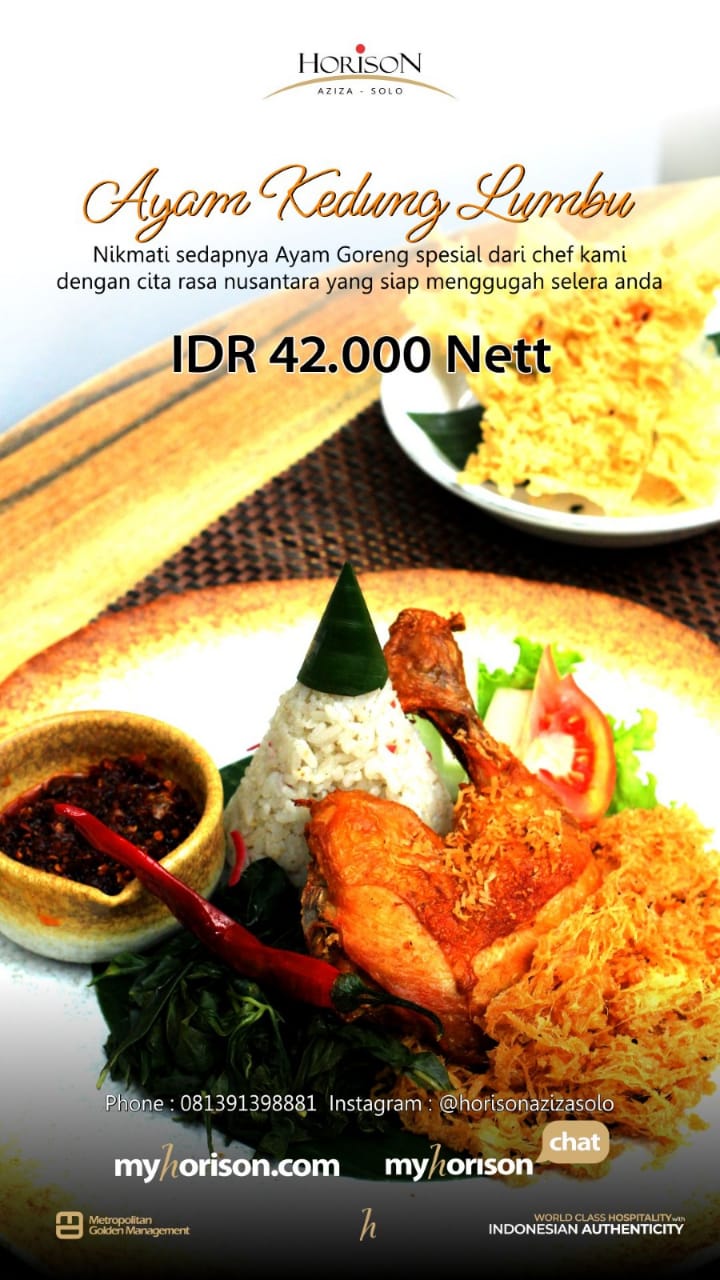 Tidak hanya itu, promo Horison Aziza Solo berlanjut dengan adanya menu Ayam Kedung Lumbu dimana cita rasa autentik Solo hadir dalam hidangan ayam yang kaya akan bumbu tradisional. Ayam yang dimasak dengan sempurna ini disajikan bersama nasi hangat, sayuran segar, sambal dan juga kremes serta peyek renyah yang menawarkan sensasi rasa mendalam dan lezat, cukup dengan Rp 42.000,- per porsi.