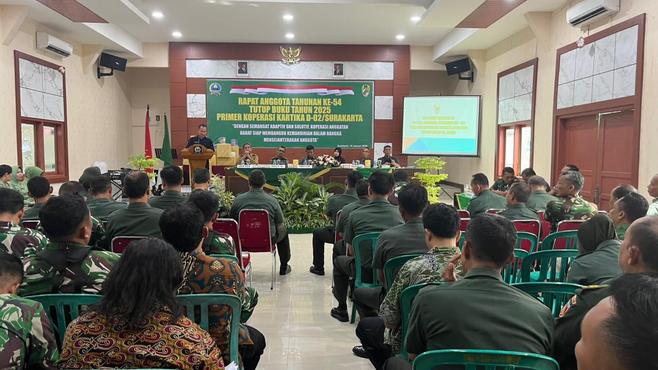 Pembina Primer Koperasi (Primkop) Kartika D-02 Surakarta yakni Dandim 0735/Surakarta dalam sambutannya yang dibacakan Kepala Staf Kodim Mayor Cpl Warji mengatakan bahwa Rapat Anggota Tahunan ini menjadi hal yang sangat penting sekali dimana kegiatan ini menjadi Pemegang kekuasaan tertinggi dalam kegiatan Perkoperasian, tentunya ada hal yang penting yang perlu dipertanggungjawabkan oleh Pengurus Koperasi kita di tahun anggaran sebelumnya di Tahun 2025 serta nanti pengesahan atau rencana Program kedepan di tahun 2026.